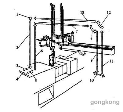 6、11-上升;7-橫行;;8、12-回旋;10-夾取物件;13-橫行回走